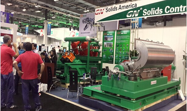 本次我公司參展的是一臺(tái)處理量達(dá)240立方米/小時(shí)(1056GPM )的泥漿清潔器和一臺(tái)GNLW553 - VFD是鉆井液離心機(jī)。GNLW553 – VFD離心機(jī)是一臺(tái)大體積大處理量的離心機(jī),具有專門的變頻器和PLC控制系統(tǒng)進(jìn)行快速處理操作。